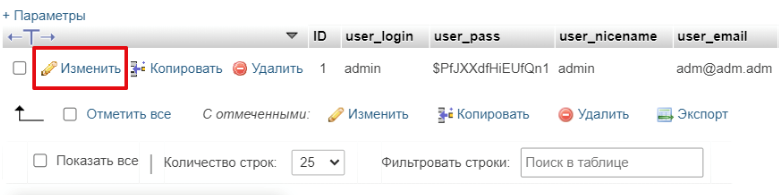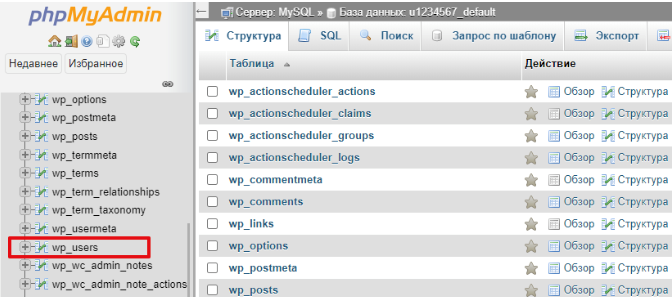 В списке таблиц кликните на таблицу префикс_users. В нашем примере префикс со значением wp:
